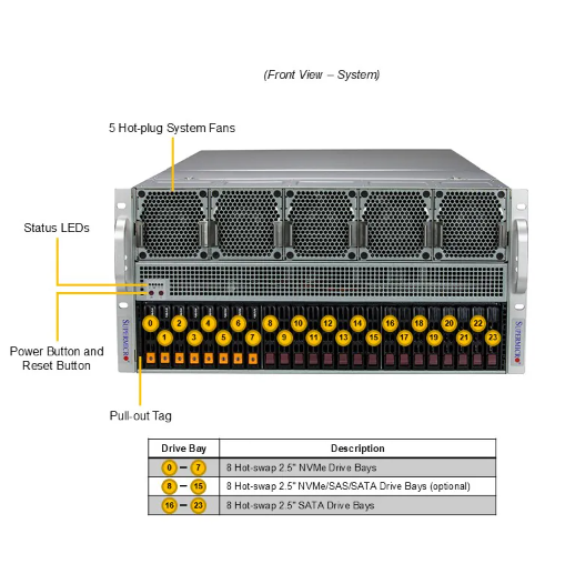 | Drive Bays Configuration | Default: Total 16 bays 8 front hot-swap 2.5" NVMe drive bays 8 front hot-swap 2.5" SATA drive bays Option A: Total 24 bays 8 front hot-swap 2.5" NVMe drive bays 8 front hot-swap 2.5" NVMe* drive bays 8 front hot-swap 2.5" SATA drive bays |